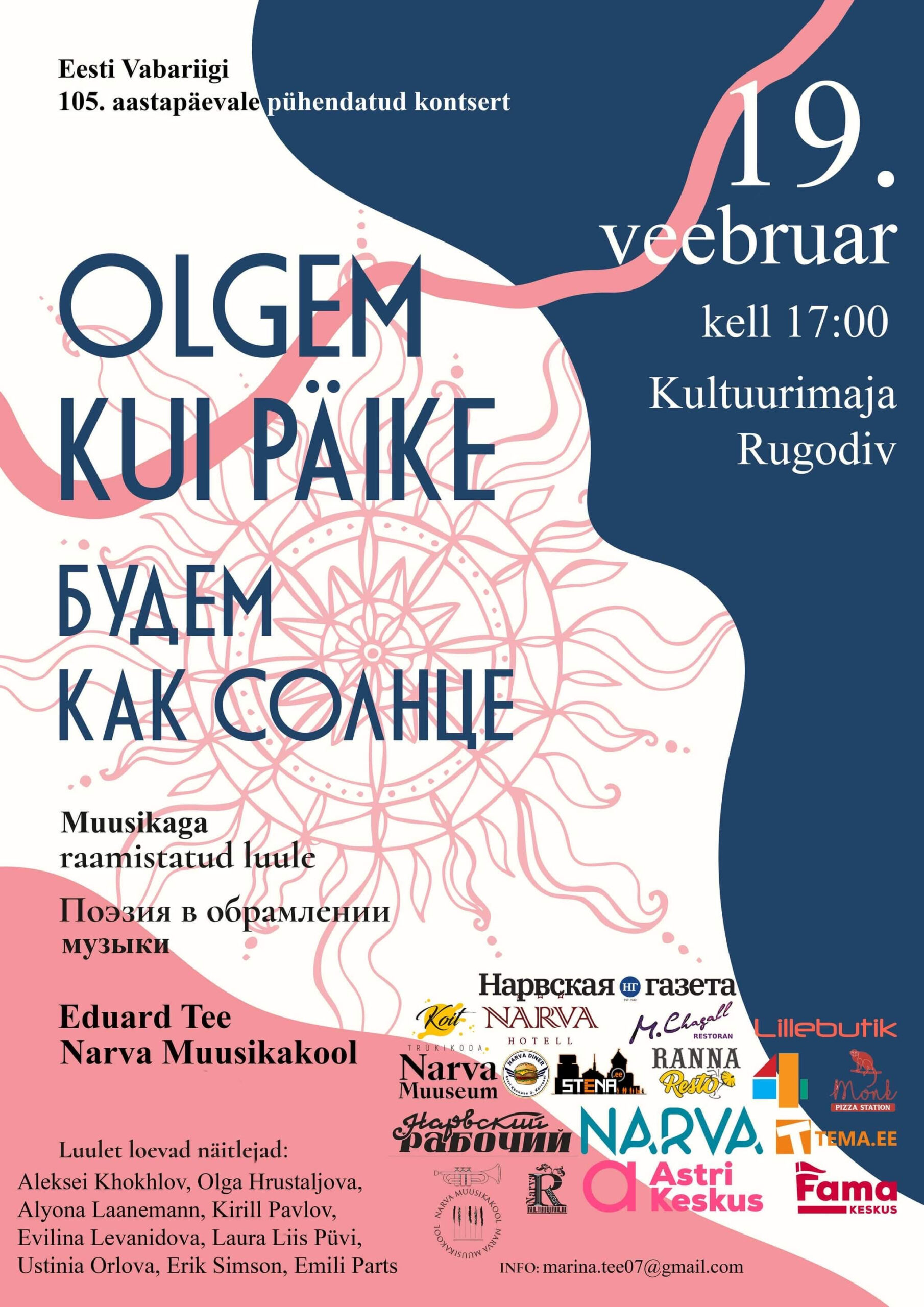 19 февраля в 17:00 в Доме культуры Ругодив состоится творческий вечер «Будем как солнце» — Поэзия в обрамлении музыки. В преддверии Дня независимости Эстонии ученики Нарвской музыкальной школы вместе с юными артистами поздравят музыкально-поэтическим концертом нарвитян. На творческом вечере стихи соединятся в единую историю, а музыка, в том числе, эстонских композиторов того времени поможет погрузиться в эпоху мистицизма и символизма. Во все времена, культура, музыка, особенно стихи, соединяют людские сердца, независимо от национальностей, языков и идеологии. В декабре 2022 года в Концертном зале Эстония в Таллинне прошел концерт «Будем как солнце» — Нарва решила продолжить проект-эстафету и провести подобный вечер с аналогичной тематикой. На концерте «Будем как солнце» прозвучат стихи эстонских поэтов периода Серебряного века – Марии Ундер, Бетти Альвер, Хейти Тальвик, Юхана Вийдинг, а также Константина Бальмонт, Игоря Северянина и других авторов. На сцене выступят ученики Нарвской Театральной студии Vaba Lava (руководитель Тийна Румм), Театра‑студия «16.komnata» НДДТ (руководители Ольга и Виталий Катунцевы), Театра Нарвской Кесклиннаской Гимназии (руководитель Татьяна Сонина). С юными артистами выступит артист Эдуард Тее. В музыкальное путешествие зрителей поведут Духовой оркестр, Хор мальчиков, и другие юные музыканты Нарвской музыкальной школы. Стоимость билетов: 5 €