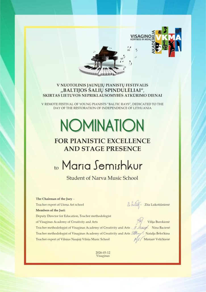 Narva Muusikakooli esindajad pälvisid järgmised nominatsioonid: Aksinja Alekseeva „esituse enesekindluse eest“ (3. klass, õpetaja Galina Dotsenko); Ester Randoja „originaalse interpretatsiooni eest“ (5. klass, õpetaja Tatjana Sokolova); Maria Semiskur „pianistliku meisterlikkuse ja lavalise väljendusrikkuse eest“ (6. klass, õpetaja Galina Dotsenko). Õnnitleme osalejaid ja õpetajaid suurepäraste tulemuste puhul!